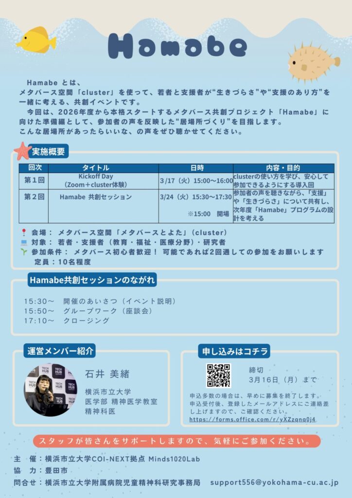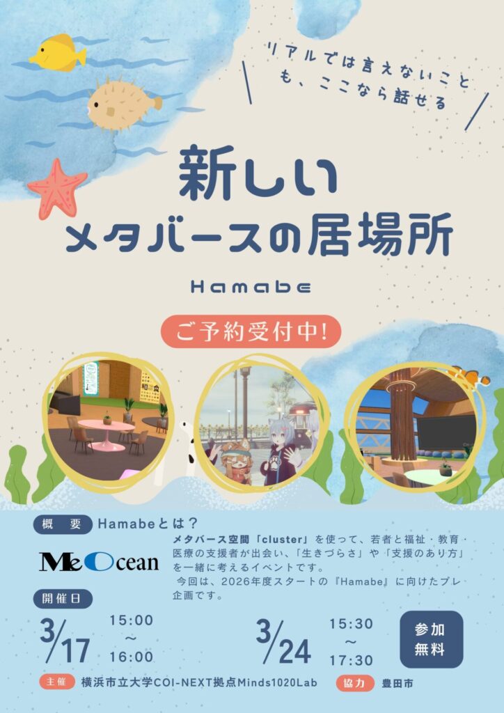公立大学法人横浜市立大学(神奈川県横浜市)のMinds1020Lab(医学部精神医学教室などによる研究チーム)は、愛知県豊田市の協力のもと、2026 年度より本格始動するメタバース共創プロジェクト『Hamabe(ハマベ)』のプレ企画を、2026 年3月17日(火)と3月24 日(火)の 2 日間にわたり開催します。本イベントは、メタバースプラットフォーム「cluster」上のワールド「メタバースとよた」を活用し、若者と、教育・福祉・医療の専門家(支援者)が、アバターを通じてフラットに交流するものです。「リアルでは言えないことも、ここなら話せる」をコンセプトに、参加者の声を反映した「居場所づくり」と「支援のあり方」を共創することを目指します。